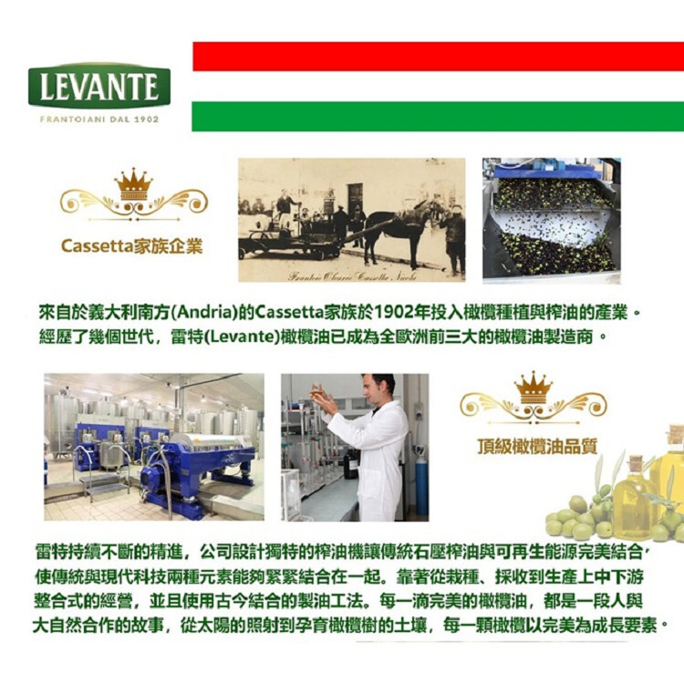 生產於義大利橄欖樹的果實,它們在陽光下適當生長後收獲,並為每道菜提供圓潤,清新溫和的味道。雷特橄欖油源於傳統,使用該領域最先進的技術生產。